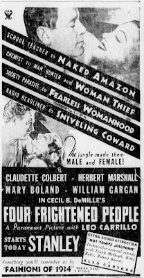 natives fling arrows through the necks of other natives.For an early sound adventure/drama, FOUR FRIGHTENED PEOPLE is alright. It's a little too melodramatic, but it's still an entertaining watch. I was particularly impressed that it was filmed entirely on location. I found myself thinking about how I would love to see a behind the scenes feature showing the film crew lugging around those old gigantic cameras through the jungle.
